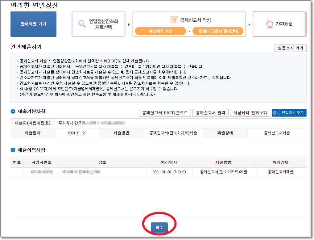 이제 공제신고서는 작성이 완료되었고 간편제출도 되었습니다. 혹시 회수가 필요하시면 아래에 있는 "회수"버튼을 눌러서 공제시고서를 회수하시면 됩니다.