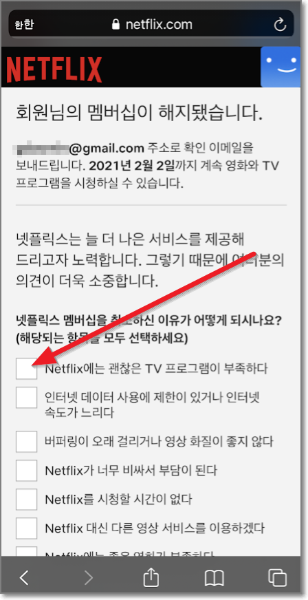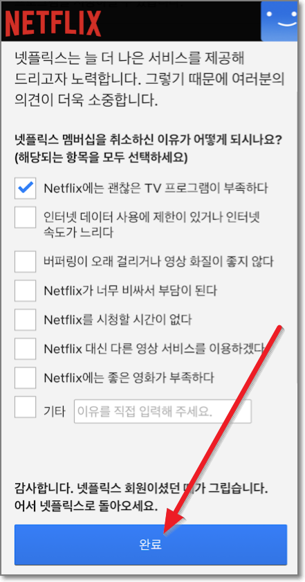 넷플릭스에는 괜찮은 티비프로그램이 부족하다고 체크하고 "완료"를 눌렀습니다. (취소이유는 개인적으로 선택하세요)