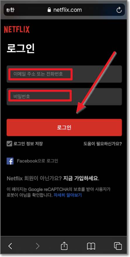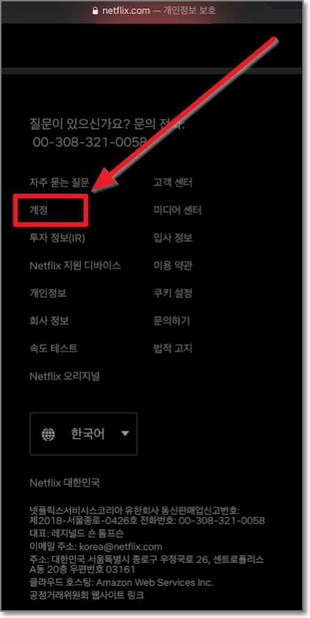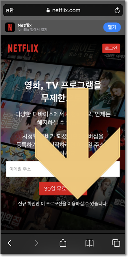 넷플릭스 앱에서 해지하려고 하면 앱내에서는 방법이 없습니다. 따라서 넷플릭스 홈페이지로 접속해야 하는데요. 넷플릭스 바로가기로 준비해놓았으니 바로 넷플릭스 모바일 홈페이지로 여시고요. 새창으로 열리면 아래처럼 넷플릭스 모바일 홈페이지가 뜹니다. 여기서 화면을 밑으로 쭉 내립니다.