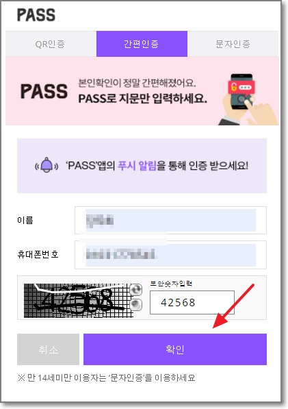 PASS를 가입해 두셨다면 아래처럼 패스 인증으로 진행됩니다. 모두 확인이 되고나면 휴대폰에서도 패스인증을 합니다.