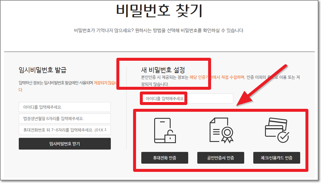 해야 할일은 바로 새 비밀번호 설정입니다. 아이디를 입력하고 아래에 있는 인증수단중에서 편한것을 골라서 본인인증을 진행합니다. 여기서는 휴대폰으로 해보겠습니다.