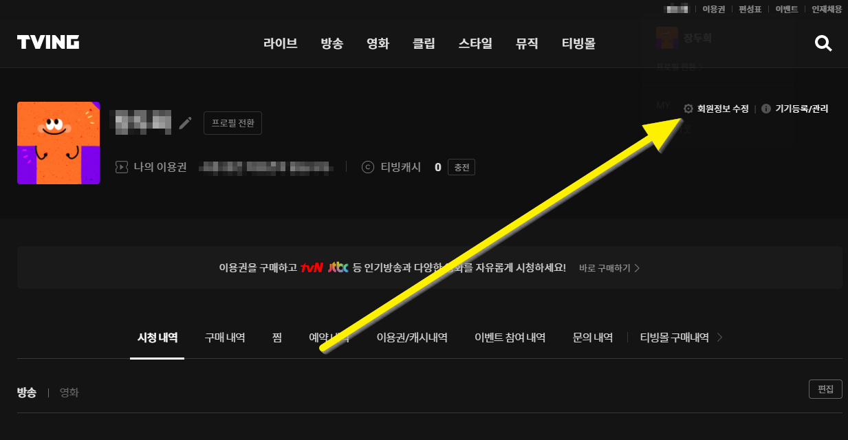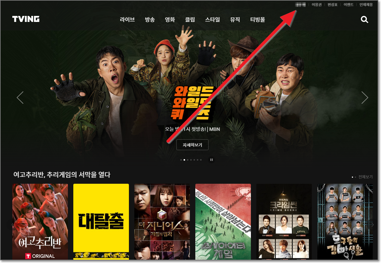 우선 티빙홈페이지 바로가기로 새창을 열고 로그인을 하고나면 아래처럼 자신의 이름을 누릅니다.