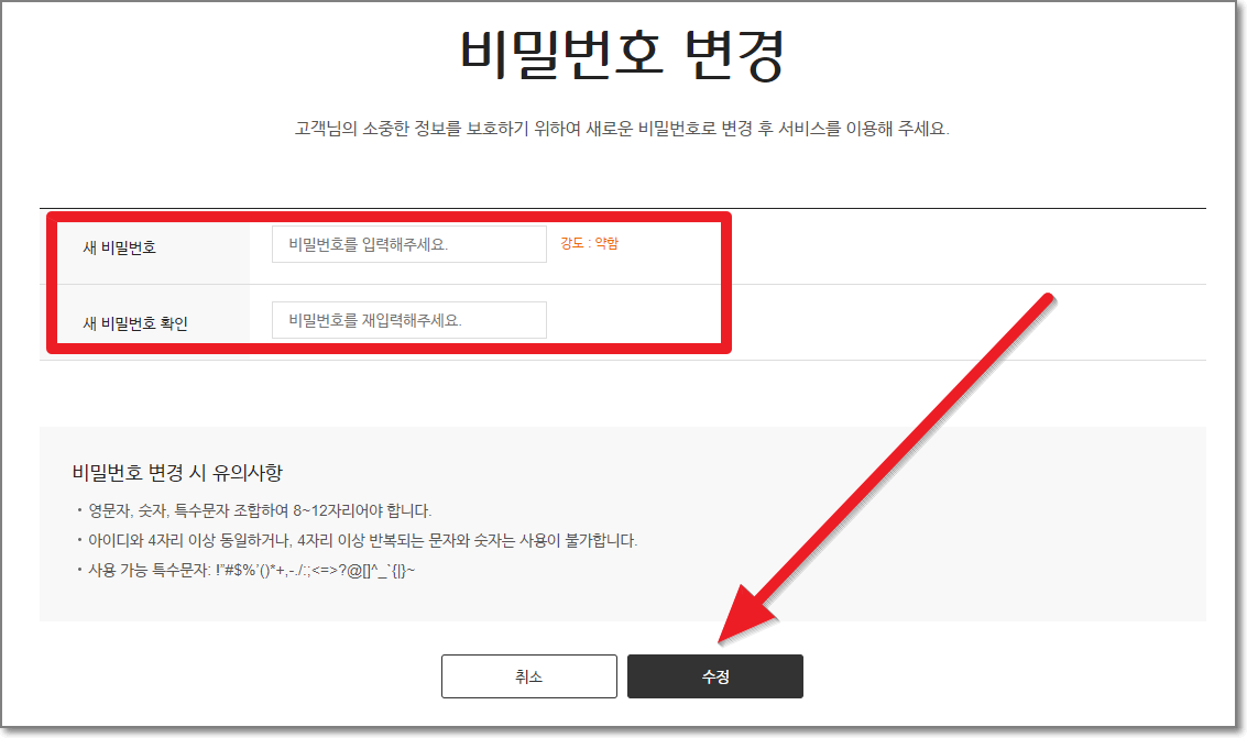 비밀번호 변경이 나오면 "새 비밀번호"를 두번 연속 입력하고 아래에 있는 "수정"을 누릅니다.