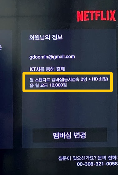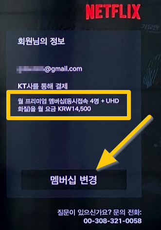 대부분의 사람들이 넷플릭스 첫달은 무료이기 때문에 가장 비싼 요금제인 14500원 4인 UHD로 하실텐데요. 실제로 결제를 하려고 고민하다 보면 "스탠다드 멤버십" 12000원짜리 (2개 기기 동시접속)도 괜찮을 거라는 생각이 드실 수 있습니다. 그래서 바로 멤버십 재시작 하시지 마시고 우선 멤버십 변경부터 하셔야 합니다. 아래처럼 확인해보시면 프리미엄 멤버십으로 되어있으실 거에요. 여기서 "멤버십 변경"을 리모컨을 이용해서 누릅니다.