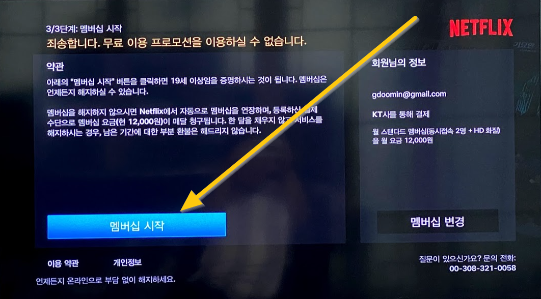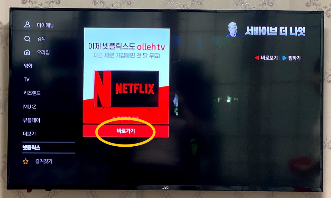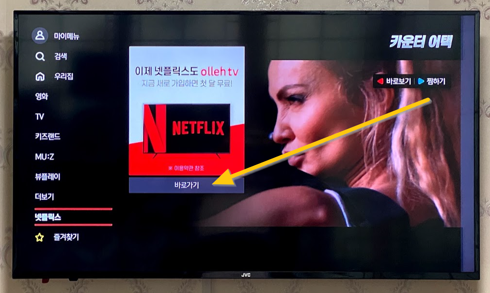 지금 새로 가입하면 첫 달 무료라고 써 있지만 전 이미 한달을 소진했기 때문에 멤버십을 재시작해야 하는 상황입니다. 노란동그라미 친 "바로가기"를 리모콘으로 누릅니다.