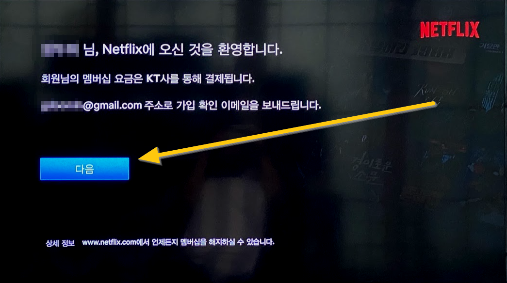ㅇㅇ님 넥플릭스에 오신 것을 환영합니다.(좀 디테일하게 하려면 "다시"를 넣어 주었으면 어떨까 하네요). 회원님의 멤버십 요금은 KT사를 통해 결제됩니다. 그리고 이메일 주소로 가입 확인 이메일을 보내드렸습니다. 라고 나오는데요. 따로 이메일을 확인해야만 볼 수 있는 것은 아닙니다. "다음"을 누릅니다.