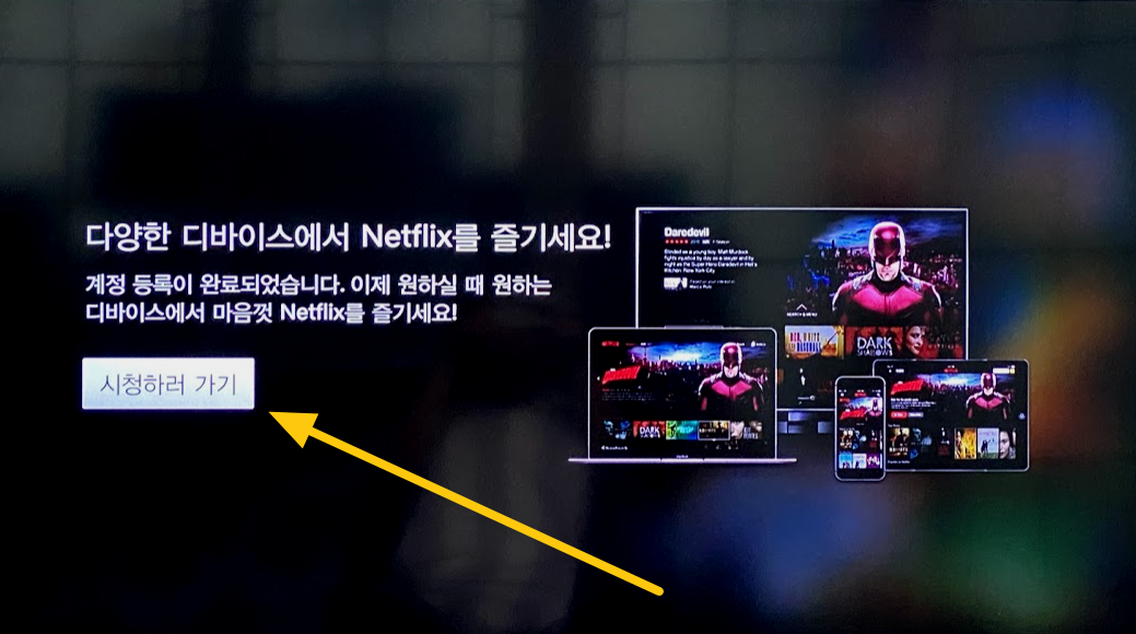 사실 넷플릭스의 가장 마음에 드는 부분이 바로 이건데요. 원하는 디바이스에서 마음껏 넥플릭스를 즐기라고 나와있습니다. 인터넷 연결 지원 디바이스에 대해서는 참고해주시고요. 폰에서 1회 중간까지 봤으면 집에 와서 티비로 그 영상을 재생하면 바로 폰에서 멈춘 그부분부터 재생이 되는데, 이 기능이 매우 마음에 들고 훌륭합니다. "시청하러 가기"를 누릅니다.