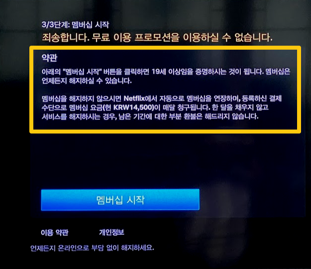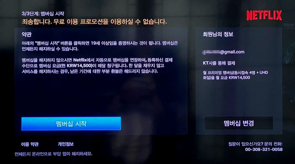그러면 이제 아래처럼 일단 무료이용 프로모션(한달 공짜로 보는 것)은 이용하실 수 없다고 나오고요. 약관과, 오른쪽에 넷플릭스 가입정보가 나오게 됩니다.(정확히 말하면 해지전 가입정보겠지요). 그런데 여기서 바로 멤버십 재시작을 누르지 마시고 우선 꼼꼼히 읽어보셨야 합니다. 지금부터 내용을 말씀드리겠습니다.