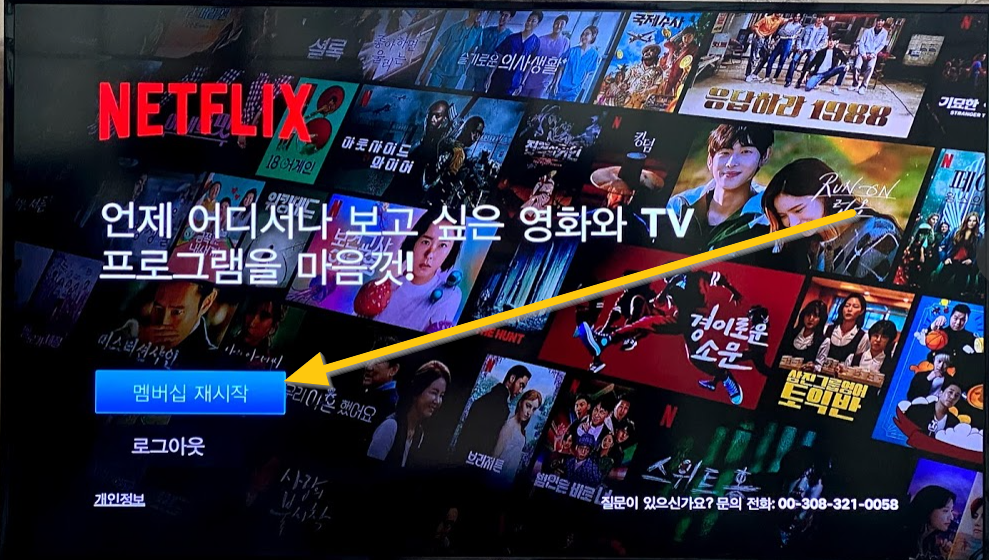 드디어 넷플릭스 화면이 나왔습니다. 여기서 "멤버십 재시작"을 누릅니다.