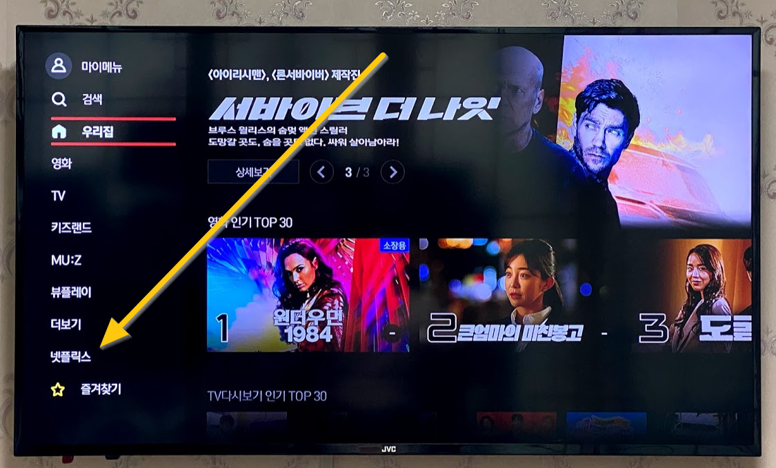 우선 티비를 켜고 아래처럼 "넷플릭스"로 내립니다.