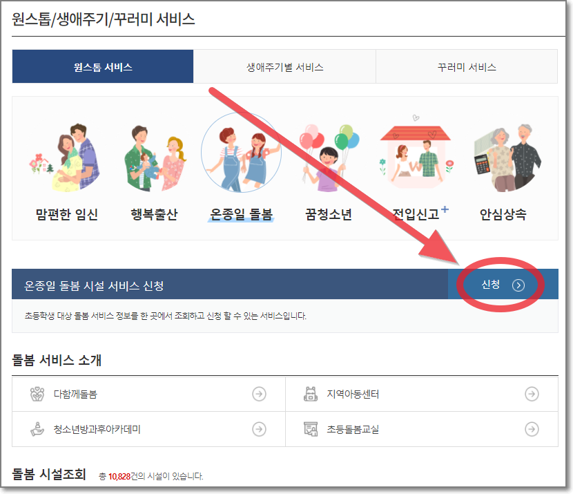 그리고 나오는 온종일 돌봄 시설 서비스 신청 오른쪽에 있는 "신청"을 눌러서 신청하시면 됩니다.
