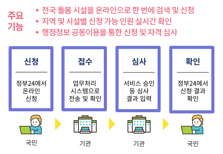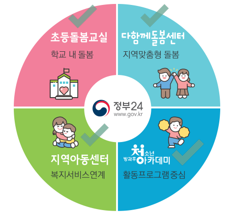 이 서비스는 "초등학생" 대상 돌봄서비스이며 보건복지부와 여성가족부 그리고 교육부등 3개 부처에서 4개의 돌봄시설에 대해서 정부24에서 조회하고 신청도 할 수 있는 서비스입니다.