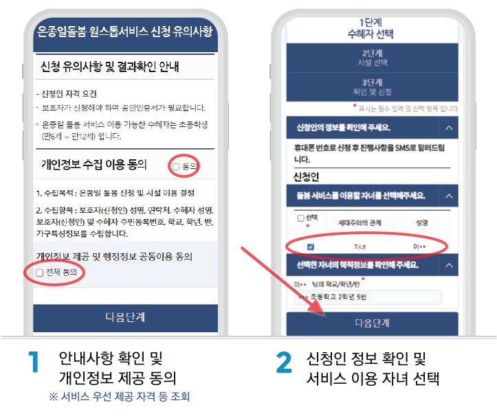안내사항을 확인하고 개인정보 제공에 동의를 누르시고 신청인 정보를 확인하고 자녀의 이름과 학교 학년과 반을 확인한 후 "다음단계"를 누릅니다.