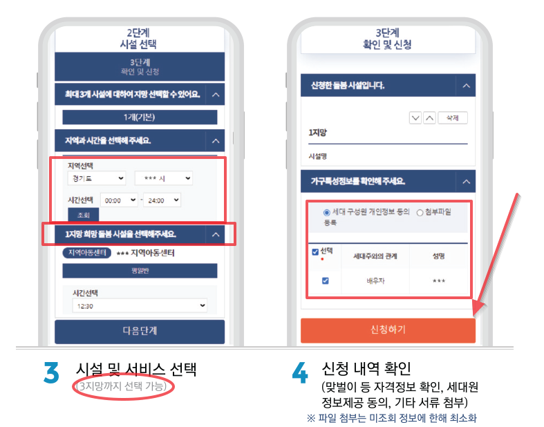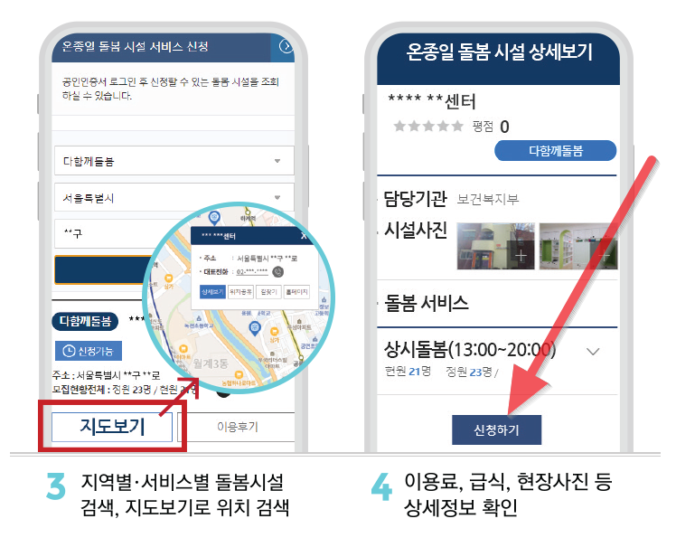 지역별.서비스별 돌봄시설을 검색하고 지도보기로 위치를 검색할 수 있으며 이용료와 급식 그리고 현장사진등의 상세한 정보를 확인하실 수 있으며 밑에 있는 "신청하기"를 누릅니다.