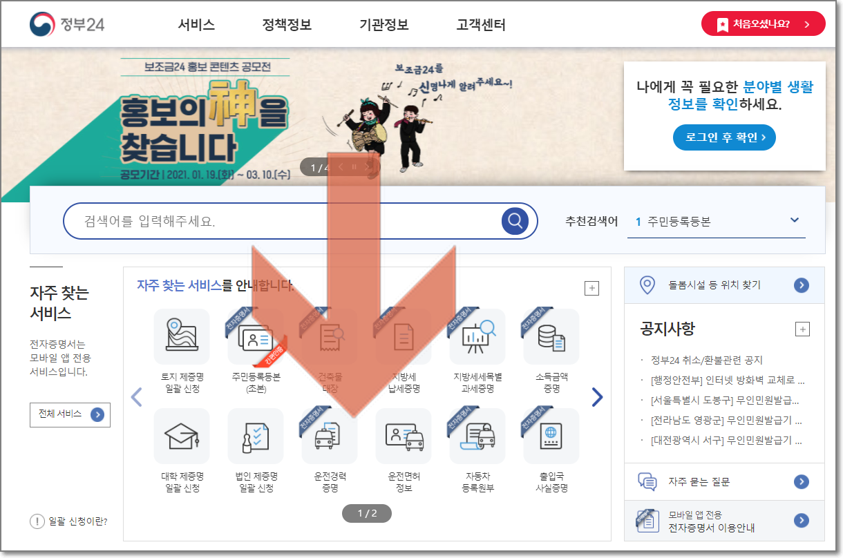 우선 정부24 홈페이지에 들어가서 아래쪽으로 스크롤을 조금 내립니다. 물론 공동인증서(구.공인인증서)로 로그인이 되어있어야 합니다.