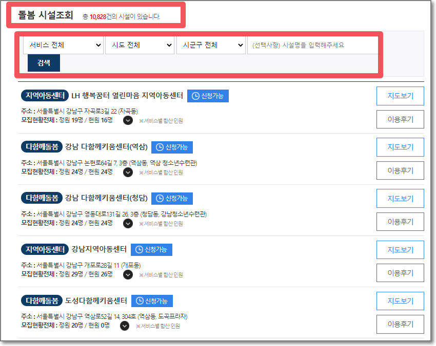 또한 거주지 근처에 돌봄시설이 어디에 있는지 지도를 통해서 확인해볼 수 있는 방법이 있습니다.