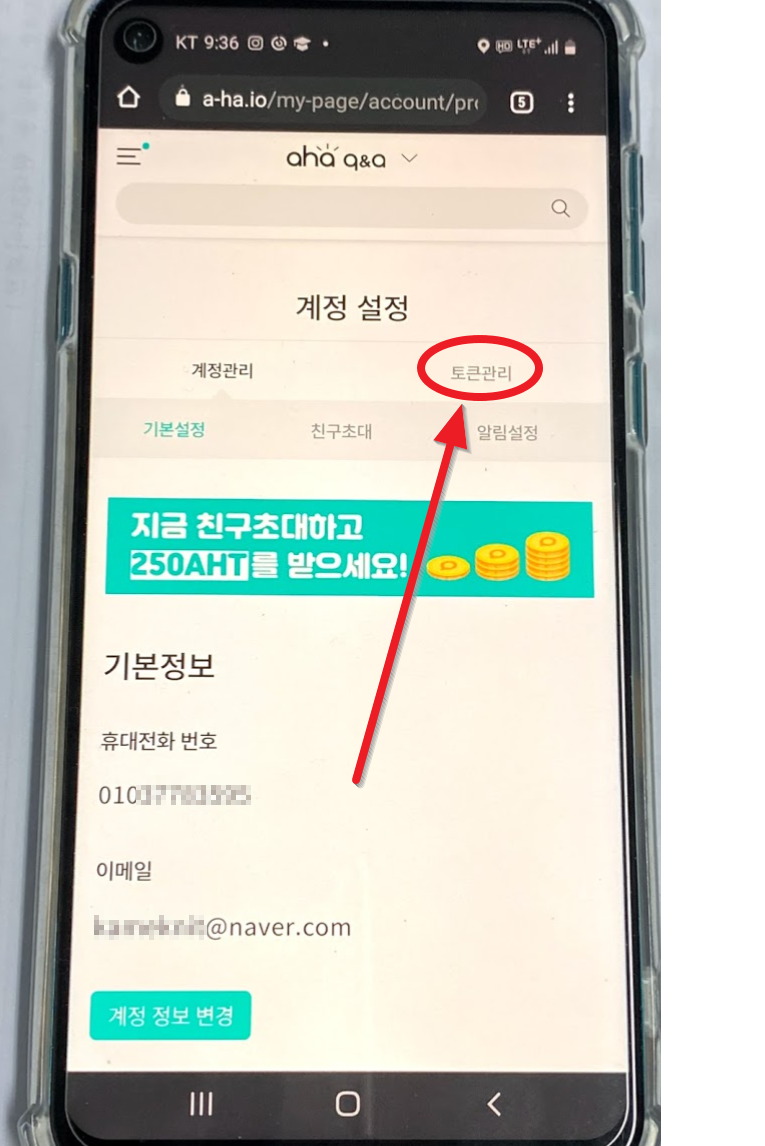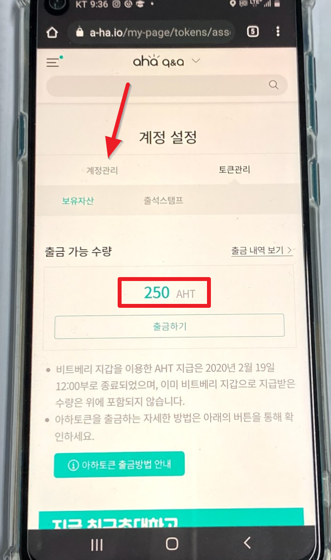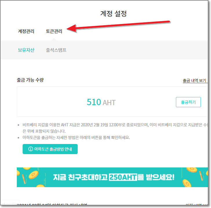 계정 설정에서 "토큰 관리"를 누르면 현재 얼마가 있는지 보이는데요. 회원가입을 했으므로 250 AHT가 있는 것을 볼 수 있습니다. 이상태에서 "계정관리"를 누릅니다.