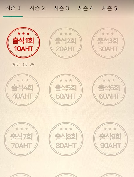 오늘의 출석체크를 완료했다고 나오면 "확인"을 누르고 화면을 내려보면 출석 1회 10 AHT를 확인하실 수 있습니다. 여기서 잘 보면 둘째 날은 20, 셋째 날은 30을 주는 것이라는 점인데요 마지막 30일째에는 1번 출첵에 300 AHT를 주는 것입니다. 그래서 한 달에 4650 AHT를 지급받게 되는 것이지요.(최대 5개월까지 가능해서 출첵만 잘해도 총 23250 AHT를 받게 됩니다.)