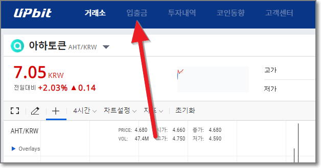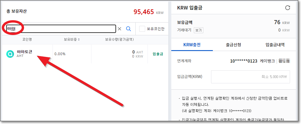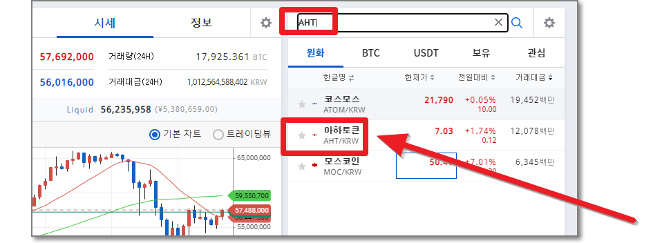 업비트에 들어가서 로그인을 하고 우측 상단 검색창에 AHT라고 입력하면 아래쪽에 바로 "아하 토큰"이 보입니다.