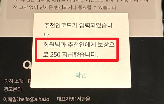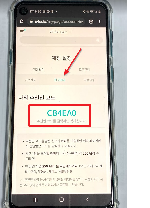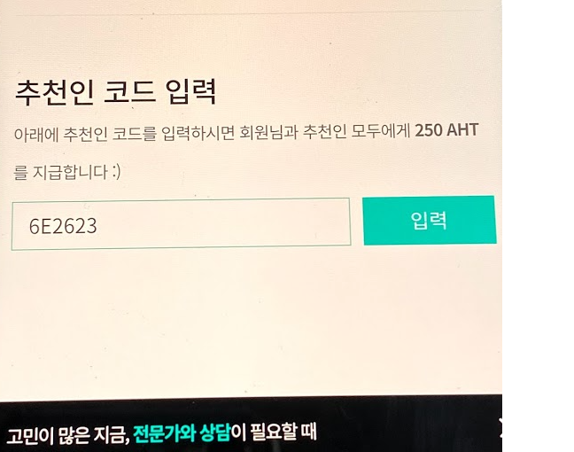 계정관리를 누르고 "친구 초대"를 누르면 본인의 추천인 코드가 나옵니다. 나중에 친구들한테 나의 추천인 코드를 알려주면 나와 친구 모두 250 AHT씩 받게 됩니다. 이상태에서 스크롤을 내려면 밑에 "추천인 코드 입력"란이 있습니다.