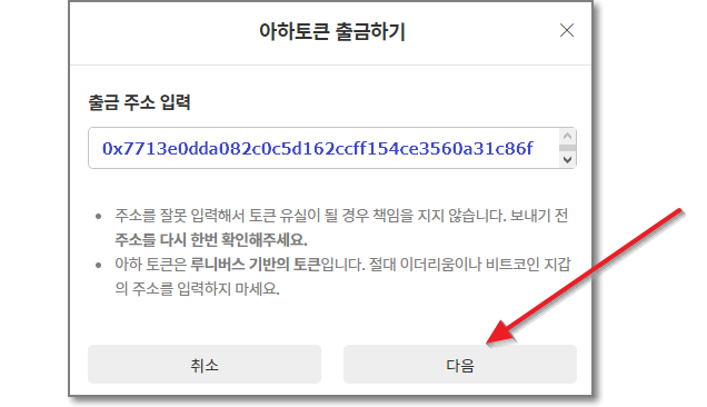 아래와 같은 아하 토큰 출금하기에서 "출금 주소 입력"에 아까 업비트에서 얻은 주소를 붙여 넣기 하고 "다음"을 누릅니다.