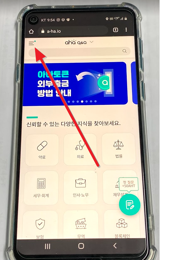 복사한 내용을 카카오톡 피시 버전으로 나에게 보내기를 해도 되고 또는 아하 홈페이지를 pc로 접속해도 됩니다. 여기서는 아하 홈페이지를 pc로 접속해보겠습니다. 아래처럼 나오면 왼쪽 위에 있는 줄 세 개(햄버거라고도 하더군요)를 누릅니다.