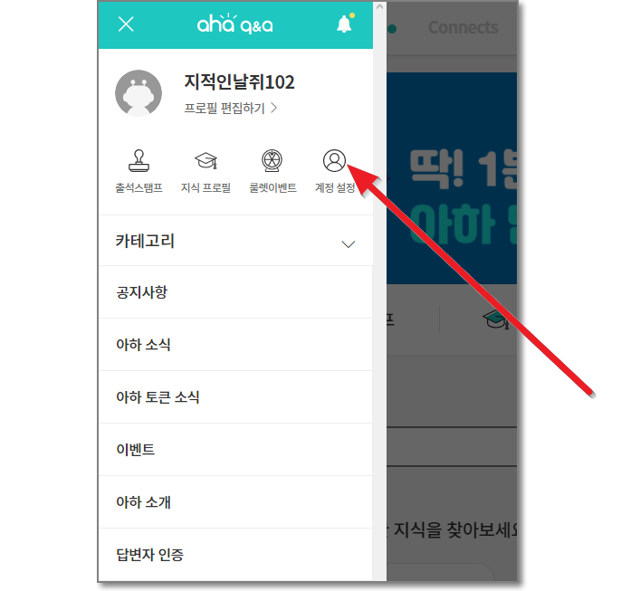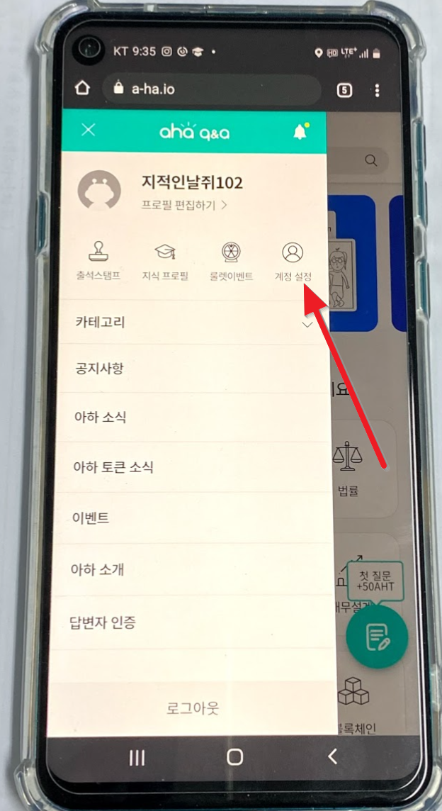 아하에 가입만 해도 일단 250 AHT가 들어옵니다. 7원이라고 치면 1750원 정도가 되지요. 화면 상단 왼쪽에 있는 줄 3개(메뉴)를 누르고 나타난 메뉴에서 "계정 설정"을 누릅니다.