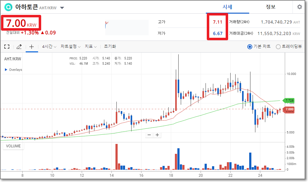 2021년 2월 25일 11시 기준으로 7원입니다. 시세를 보면 24시간 동안 6.67원에서 7.11원까지 변동하고 있음을 알 수 있으며 대략 5원에서 10원 사이를 움직이고 있습니다.