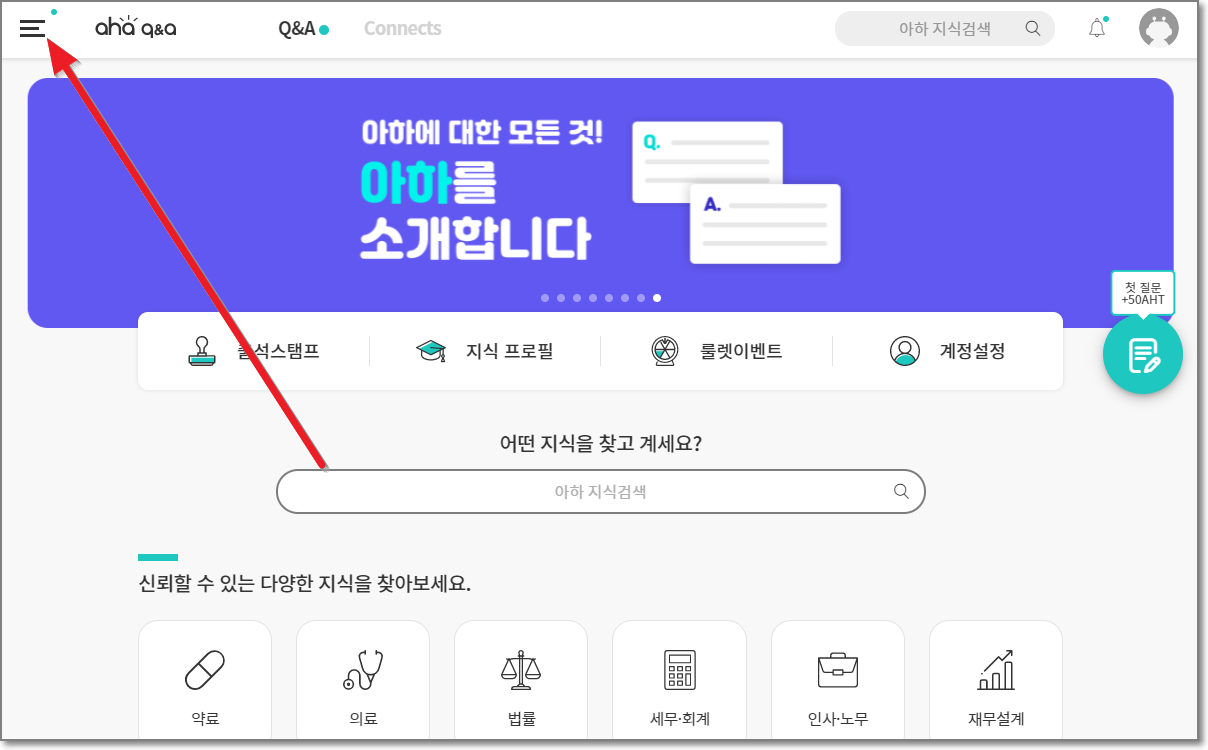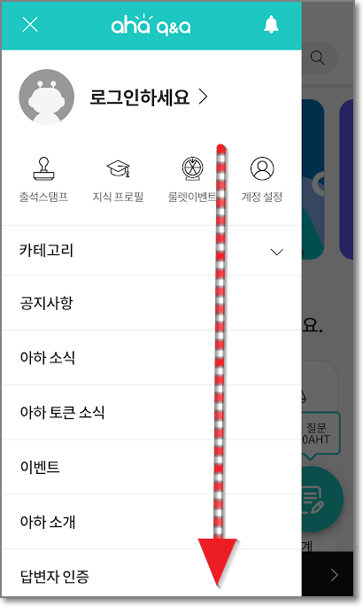 우선 아하서비스에 가입을 해야 합니다. 회원가입에 따로 돈이 들어가는 것은 아니고요. 아하 홈페이지에서 회원가입을 진행하시면 됩니다. 앞에 있는 빨간색 아하 홈페이지를 눌러서 들어가면 아래처럼 나오는데요 여기서 왼쪽 위에 줄 세 개를 누르고 "로그인하세요"가 나오면 밑으로 내립니다.(안드로이드는 바로 회원가입이 보입니다.)