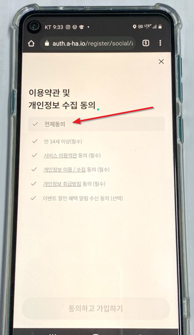 카카오로 가입하기는 쉬우니까 여기서는 네이버로 가입하기를 해보겠습니다. 네이버를 누르고 "전체 동의"를 터치합니다.