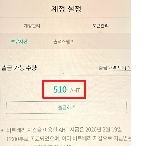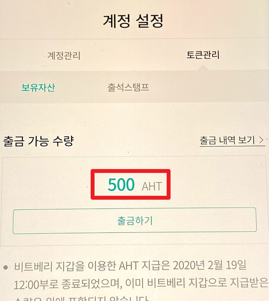 토큰 관리에서 확인해보면 방금 10을 더해서 총 510 AHT가 들어와 있는 것을 보실 수 있습니다. 약 3500원이 생긴 것입니다.