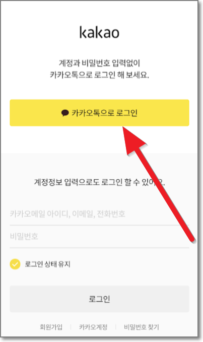 회원가입을 누르면 아래처럼 카카오로 시작하기가 있고 아래에는 네이버와 이메일로 가입하기가 있습니다. 카카오톡에 카카오 계정이 만들어져 있다면 바로 카카오톡으로 로그인을 누르면 됩니다.