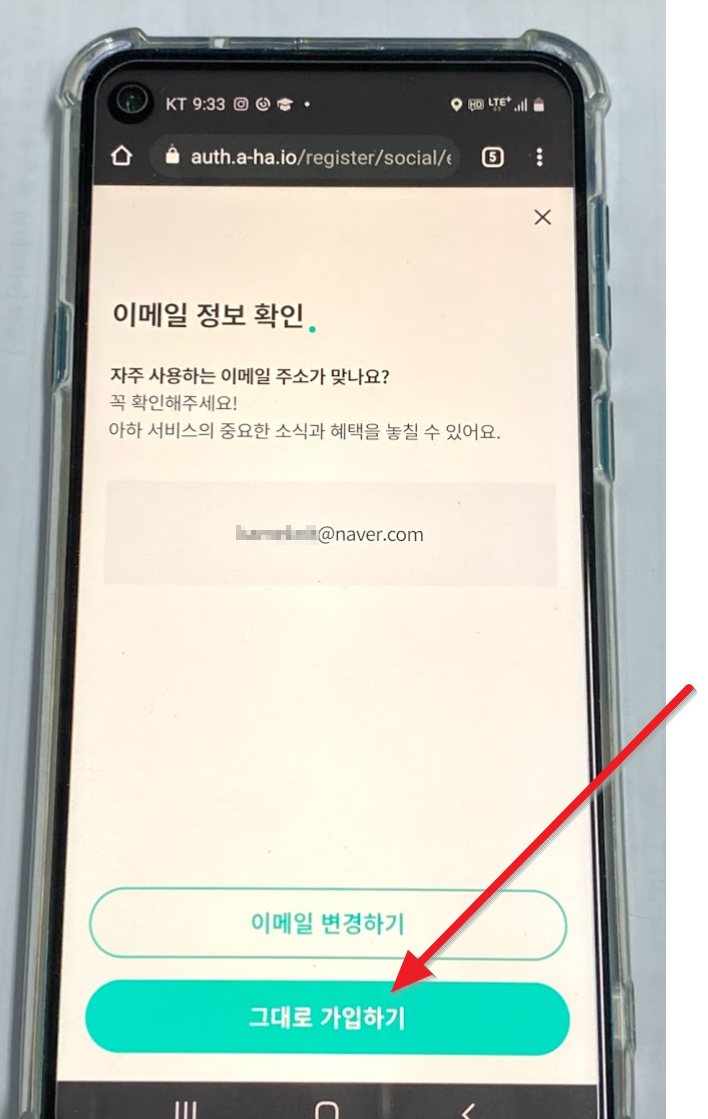 "동의하고 가입하기"를 누르고 이메일이 본인이 네이버에서 쓰는 것이 맞는지 확인 후 "그대로 가입하기"를 터치합니다.