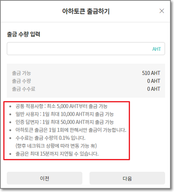 인증 답변자가 아니면 1일 최대 1만 AHT까지 출금 가능하다고 하며 1일 1회 출금할 수 있다고 합니다. 즉 150일 출첵을 다했거나 아니면 5000이 되면 바로바로 출금하셔도 됩니다. 사실 수수료가 0. 1%이기 때문에 1번에 출금하나 나눠서 출금하나 같기 때문에 어차피 인증 답변자도 아닌 경우에는 5000이 되면 바로바로 출금하시는 것을 추천해드립니다.