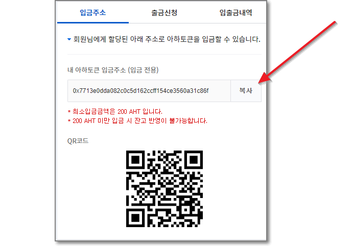 아래처럼 입금 주소가 생성이 되는데요. 길지요? 0x7713 e0 dda082 c0 c5 d162 ccff154 ce3560 a 31 c86 f라고 쓰여있는데요. 오른쪽에 "복사"를 누릅니다.