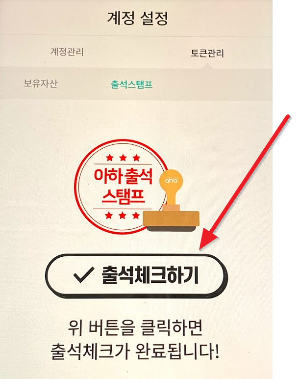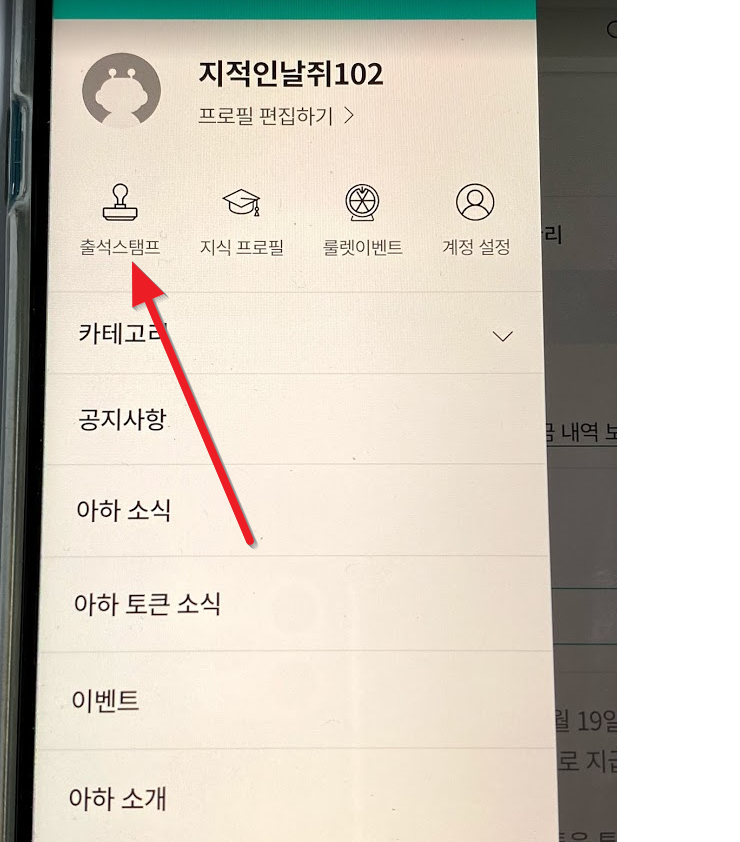 다시 왼쪽 상단에 줄 세 개(메뉴)를 누르고 이번에는 "출석 스탬프"를 누르고 다음 화면에서 "출석 체크하기"를 누릅니다.