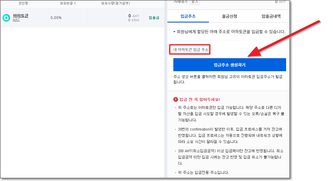 반드시 "내 아하 토큰 입금 주소"를 확인하고 "입금 주소 생성하기"를 누릅니다.