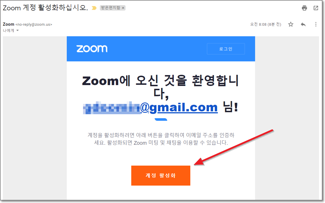 이메일을 눌러보면 아래처럼 "Zoom에 오신 것을 환영합니다, ㅇㅇㅇ@gmail.com 니!"이라고 나오고 아래쪽에 주황색으로 "계정 활성화"라고 있는데요. "계정 활성화"를 누릅니다.
