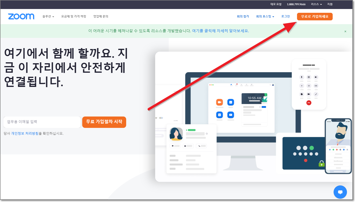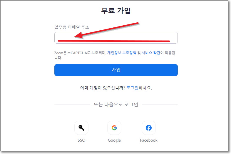 줌 사이트 바로가기를 통해서 줌 사이트를 들어가면 새창으로 열릴 것입니다. 제일 먼저 "무료로 가입하세요"를 누릅니다.