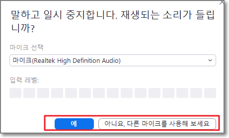 스피커에서 소리가 나올텐데요. 안 나오면 "다른 스피커를 사용해보세요"를 누르시면 되고, 마이크도 역시 되는지 확인하고 안 되면 "다른 마이크를 사용"합니다.