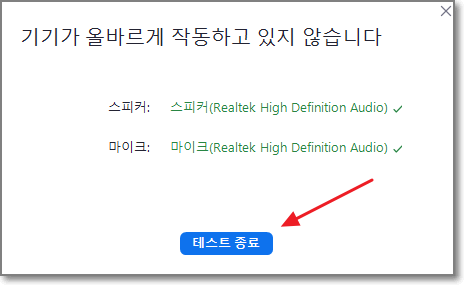 스피커와 마이크의 테스트가 끝나면 아래처럼 스피커와 마이크 오른쪽에 체크 표시가 되어 있으면 됩니다. (줌 팀 번역 똑바로 안 하네요. 기기가 올바르게 작동하는데, 작동하고 있지 않다고 나옵니다.)