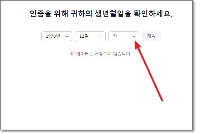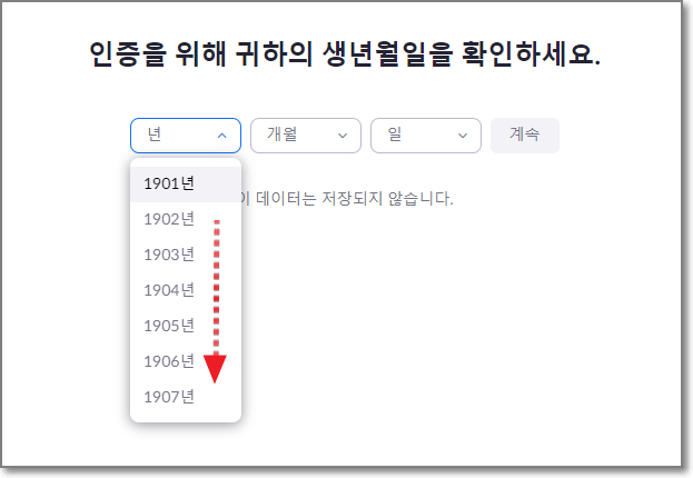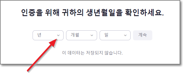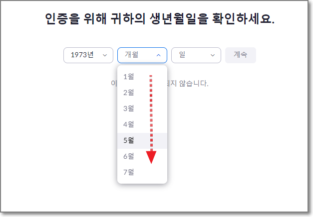 인증을 위해서 귀하의 생년월일을 확인하라고 하는데요. 아래 화살표 친 것처럼 "년" 옆에 아래로 꺽쇠 모양을 누릅니다.
