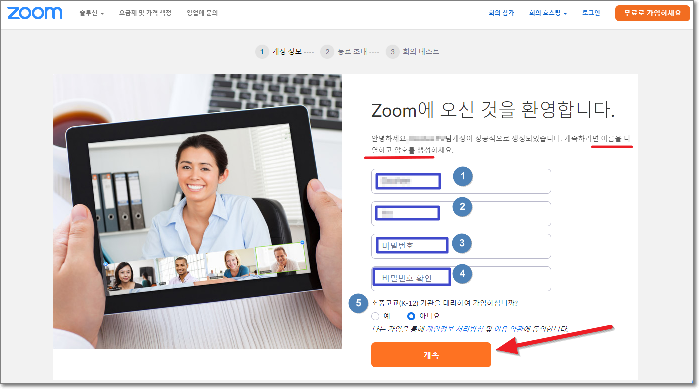 1번은 "이름"을 씁니다.(한글도 돼요), 2번은 "성"을 씁니다.(역시 한글도 되요) 그리고 3, 4번이 중요한데요. 이곳에 비밀번호를 2번 똑 같이 입력하면 되는데, 반드시 숫자와 영문 그리고 특수문자 그리고 영문은 대문자와 소문자가 모두 들어가야 합니다. 예를 들어서 21sA3921$# 이런 식으로 말입니다. 그리고 초중고등학교와 관련이 있다면 "예", 관련이 없이 개인적으로 이용 예정이라면 "아니요"에 체크하시면 됩니다. 모두 했으면 이제 "계속"을 누릅니다.