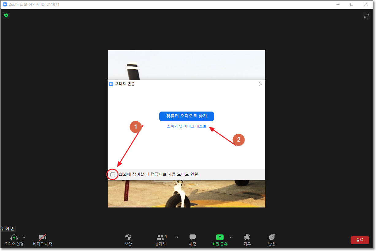 줌이 설치가 되었습니다. 이제 "회의에 참여할 때 컴퓨터로 자동 오디오 연결"에 체크하시고 "스피커 및 마이크 테스트"를 해봅니다.