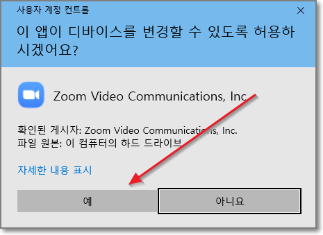 아래처럼 "이 앱이 디바이스를 변경할 수 있도록 허용하시겠어요?"라는 질문에 "예"라고 합니다.