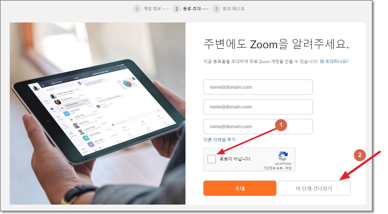 그리고 나오는 다음 화면에서 "주변에 줌을 알려주라"라고 하는데요. 그냥 "로봇이 아닙니다" 앞에 체크하고, "이 단계 건너뛰기"를 누릅니다.