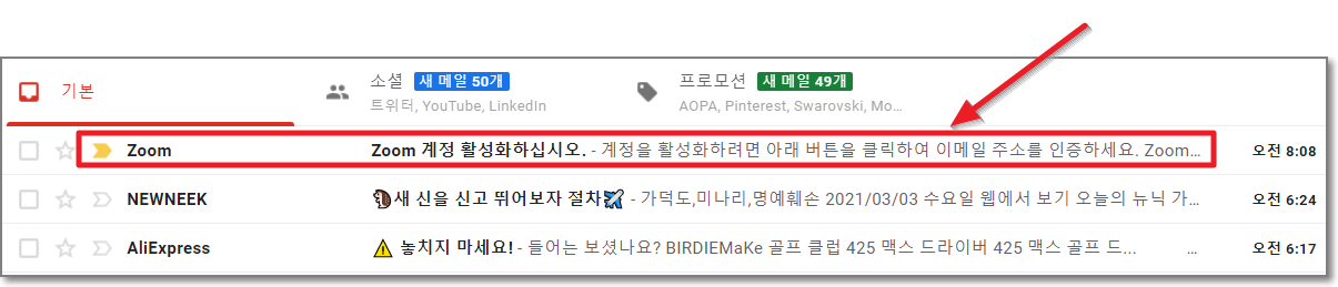 위의 방법대로 만든 구글 이메일이나 기존에 가지고 있는 이메일에 접속해서 "줌에서 온 이메일"이 있는지 확인합니다. "Zoom 계정 활성화화십시오"라는 메일이 와있네요. 줌에서 온 메일을 눌러서 확인합니다.