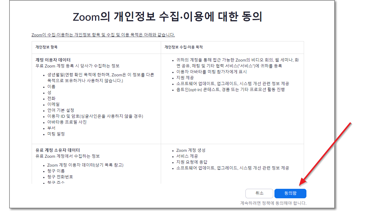 줌(zoom)의 개인정보 수집. 이용에 대한 동의가 나오는데요. 민감한 정보는 없어요. 아래쪽에 파란색 "동의함"을 누르시면 됩니다.