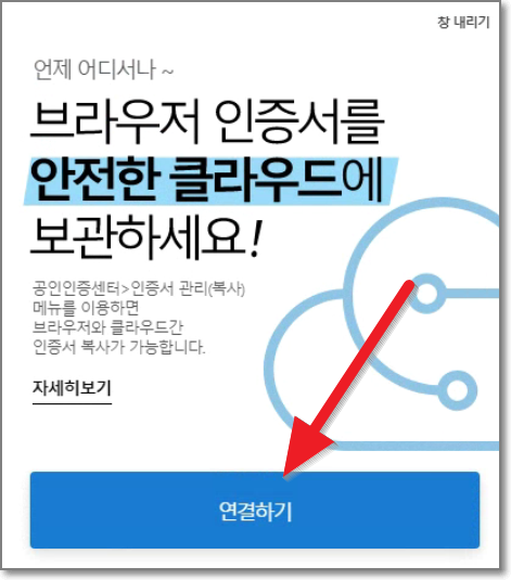 언제 어디서나 브라우저 인증서를 안전한 클라우드에 보관하라고 하네요. "연결하기"를 누릅니다.