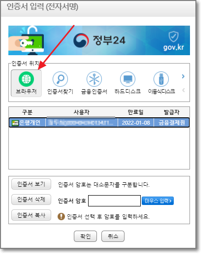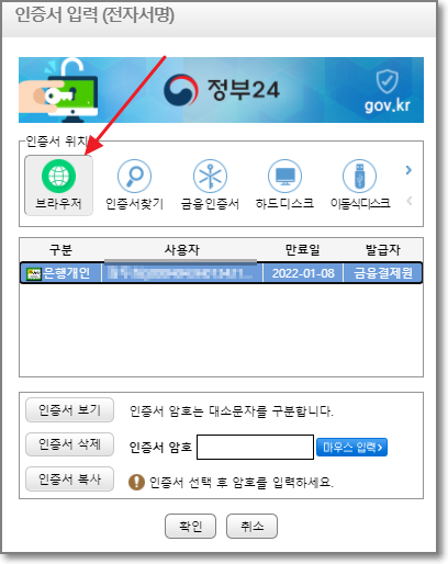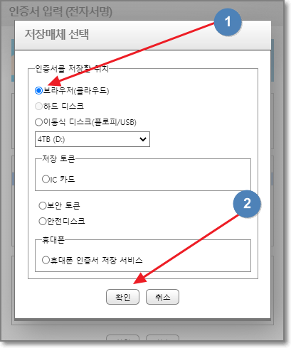 저장매체 선택창에서 "인증서를 저장할 위치"를 "브라우저(클라우드)"로 하고 아래쪽에 확인을 누릅니다.